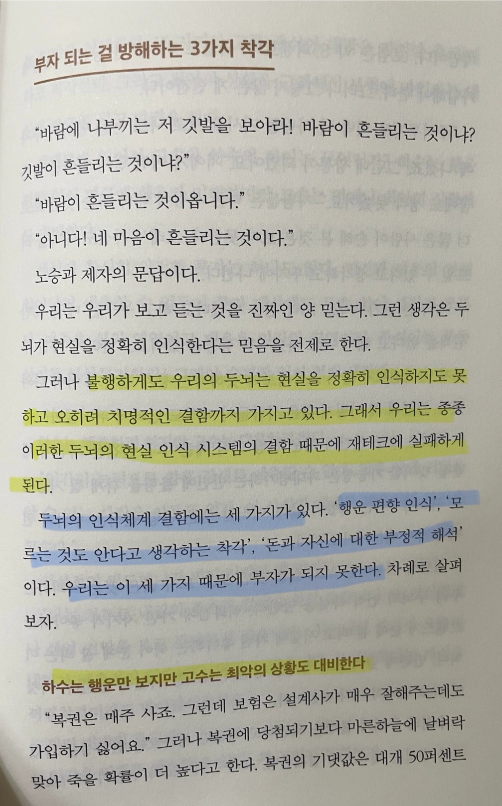 p.193 두뇌의 인식체계 결함에는 세 가지가 있다. '행운 편향 인식', '모르는 것도 안다고 생각하는 착각', '돈과 자신에 대한 부정적 해석' 이다. 우리는 이 세 가지 때문에 부자가 되지 못한다.