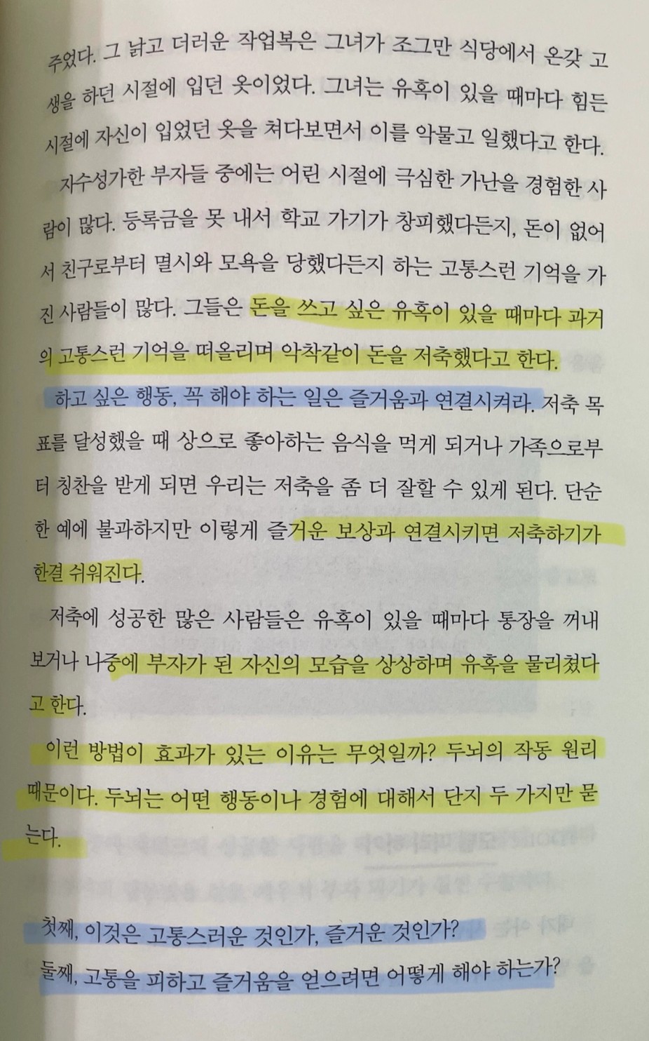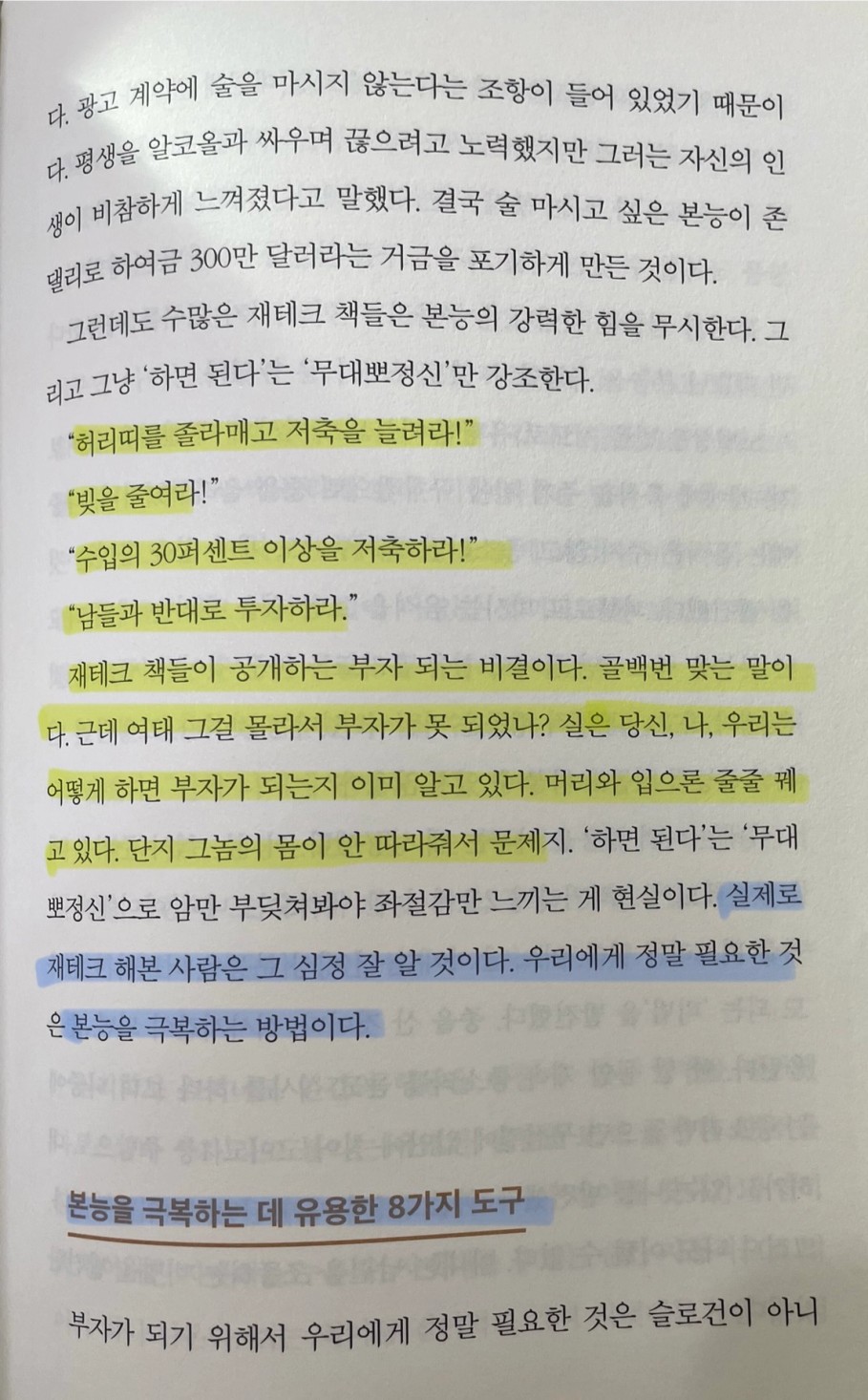p.211 실은 당신, 나, 우리는 어떻게 하면 부자가 되는지 이미 알고 있다. 머리와 입으론 줄줄 꿰고 있다. 단지 그놈의 몸이 안 따라줘서 문제지. .. 우리에게 정말 필요한 것은 본능을 극복하는 방법이다.