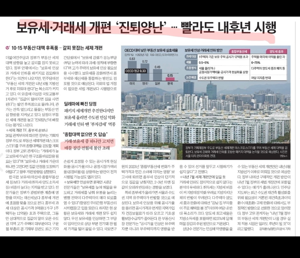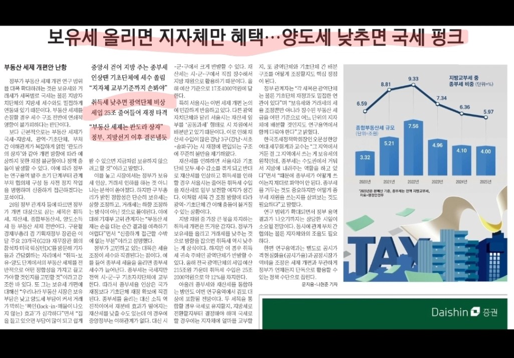 정부 의도대로 다주택자들의 물건이 나오게 하려면 보유세는 올리고 거래세는 줄여야 하는데, 거래세 줄이면 국세 펑크가 나고 보유세는 지자체들만 부유해지는 상황 (종부세) 쉽지 않아 보임.