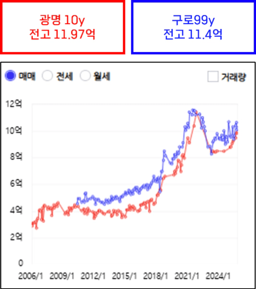 광명의 준신축과 구로에 구축 단지를 가지고 와보면