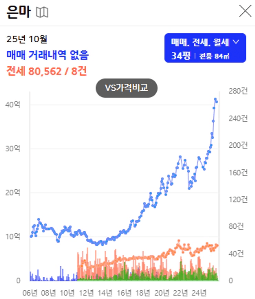 37년이 지난 2025년 지금은 전용84 기준으로 매매 가격은 40억에 거래가 되고 있습니다.