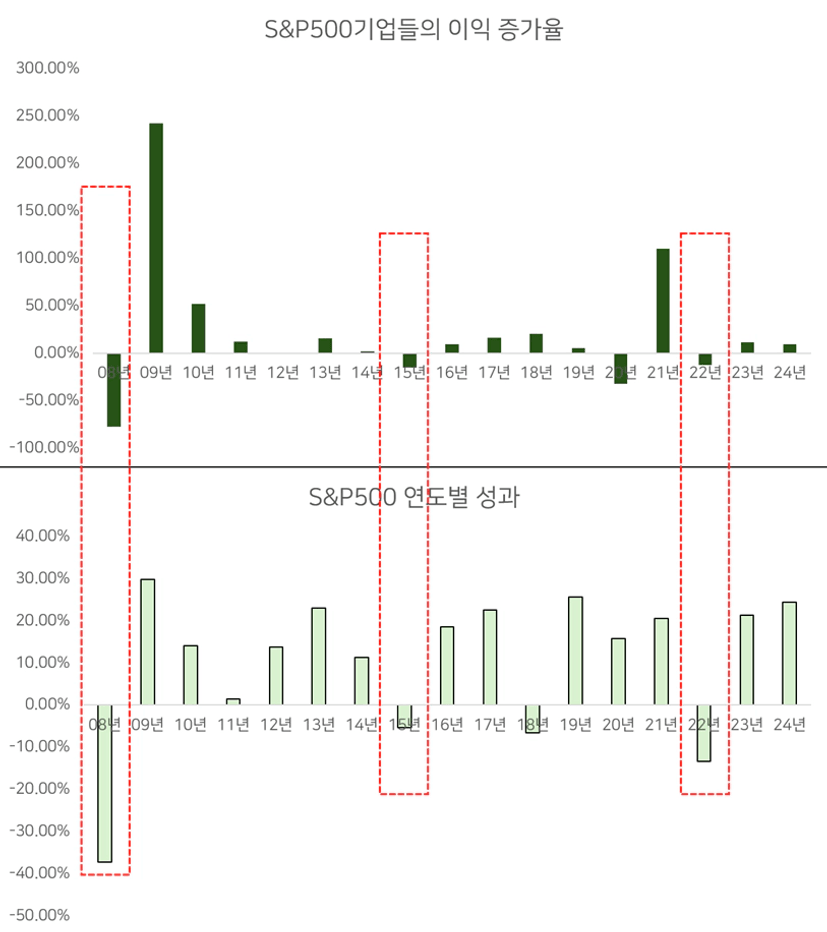 이익 성장률과 S&P500의 주가 성과를 비교한 자료입니다.