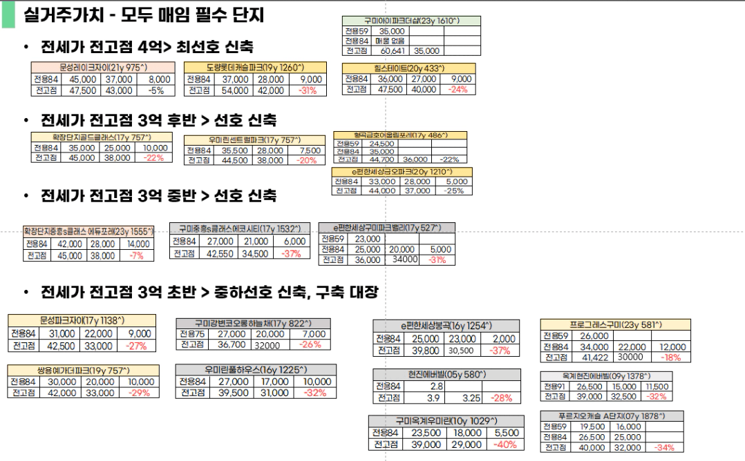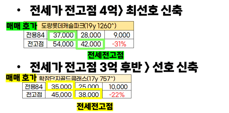 2️⃣ 전세 전고점대별로 단지들의 특징을 정리합니다.