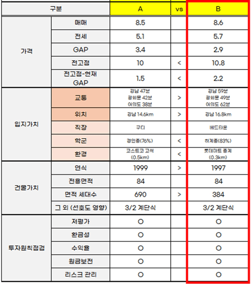 → A단지가 비록 교통/위치 부분에서 앞서나 B단지 또한 확정된 교통 호재를 가지고 있고 투자금에서 얼마 차이나지 않는데 전고점이 더 높다는 점을 감안했을 때는 B단지로 보는 것이 맞지 않을까