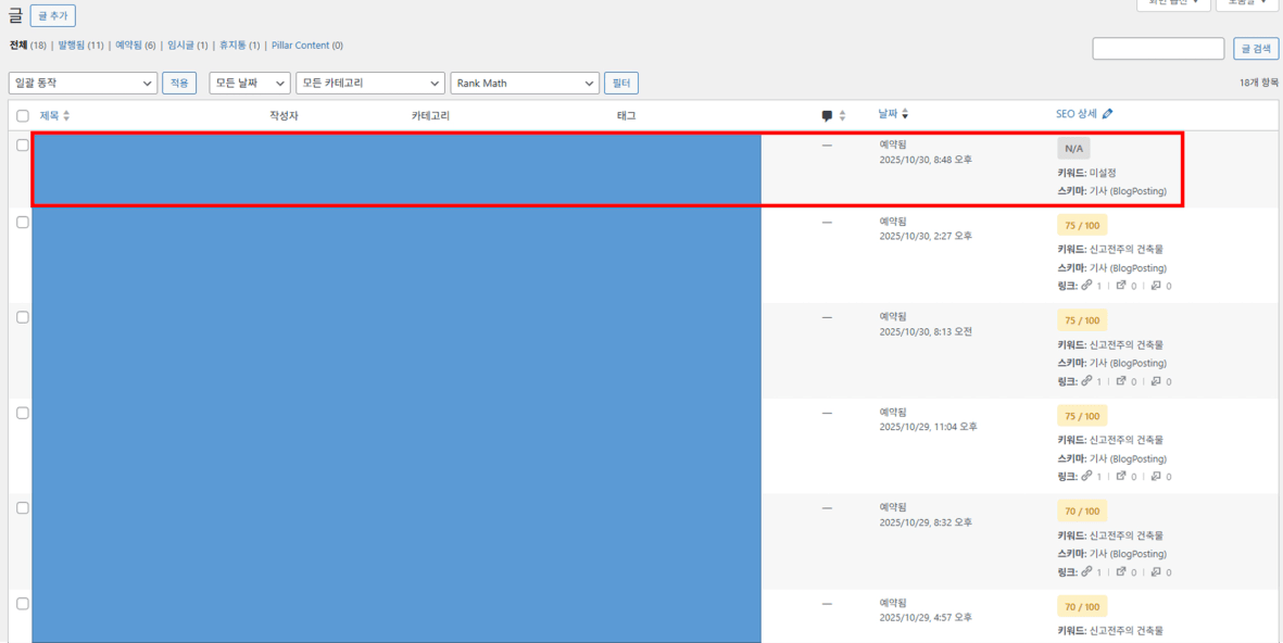 - 질문 내용: 똑같이 글을 썼는데 1개 글만 SEO상태가 N/A로 나옵니다 다른 글과 다 동일하게 했는데 아래 첨부한 이미지에서 빨간색 박스 글만 왜 저 글만 저렇게 나오는지 궁금합니다