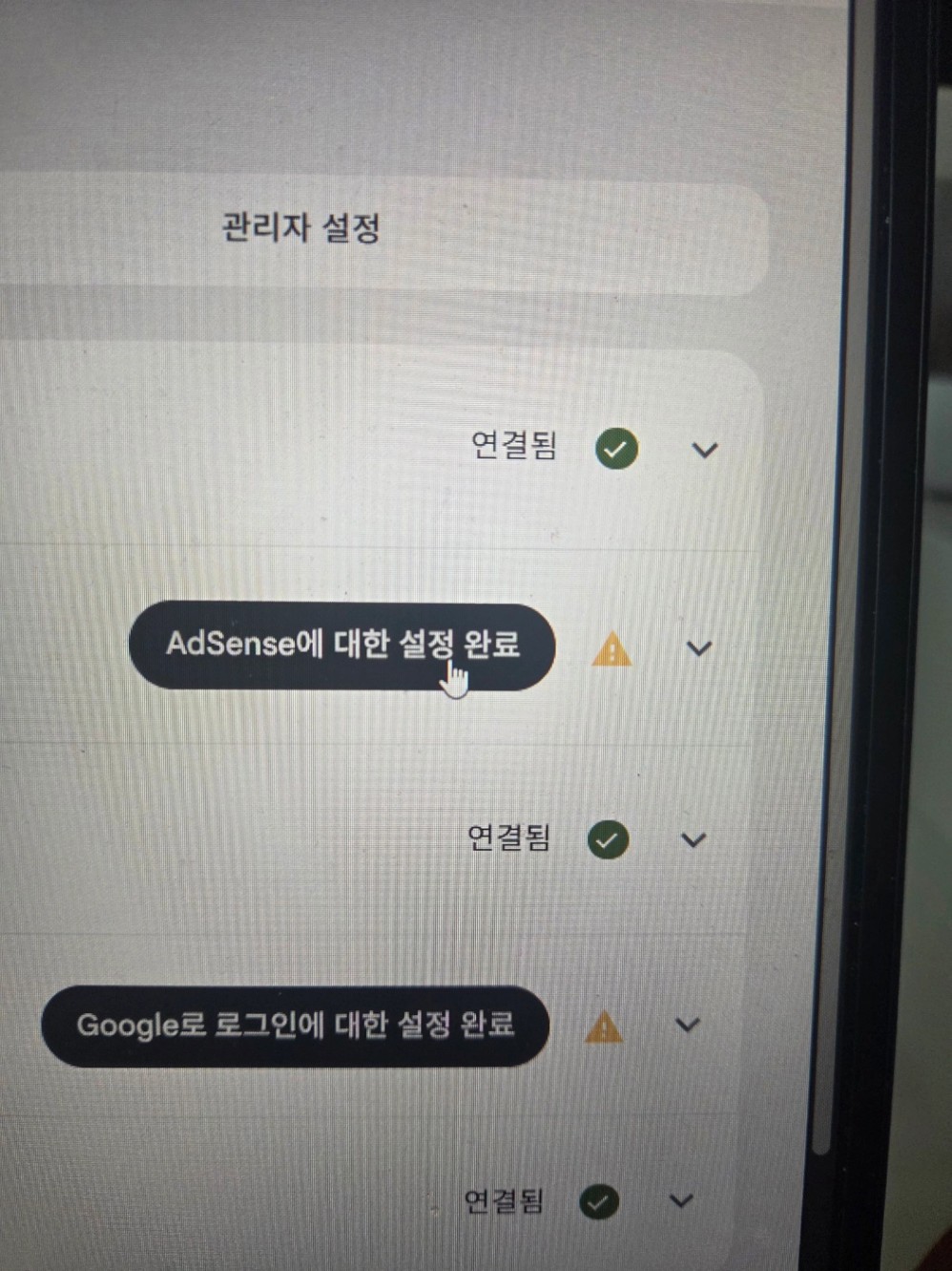 질문 1) site kit으로 들어가면 <애드센스 & goole 로그인에 대한 설정 완료> 옆에 ‘노란색 주의’표시가 뜹니다.