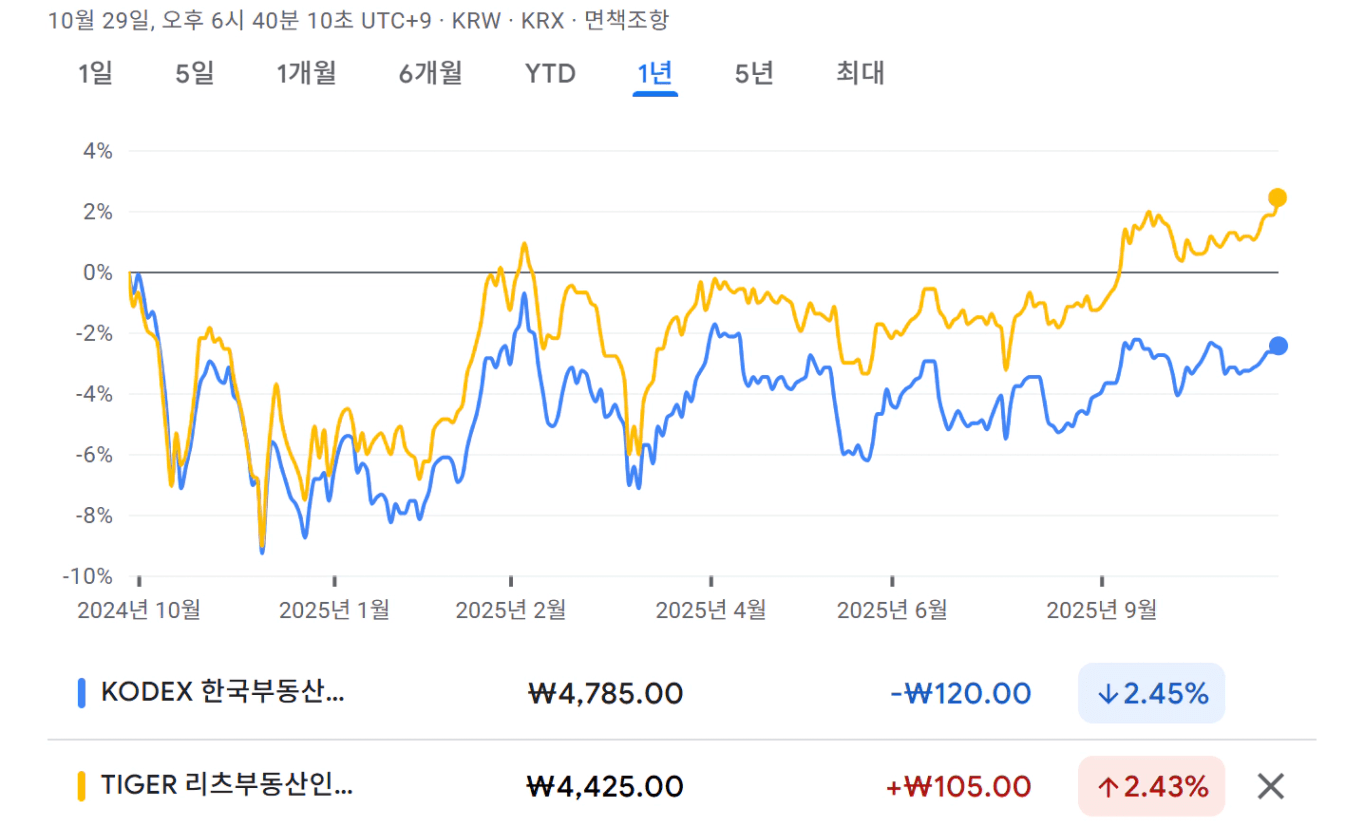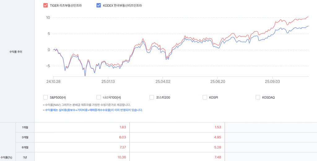 TIGER와 KODEX 부동산리츠인프라 성과 비교