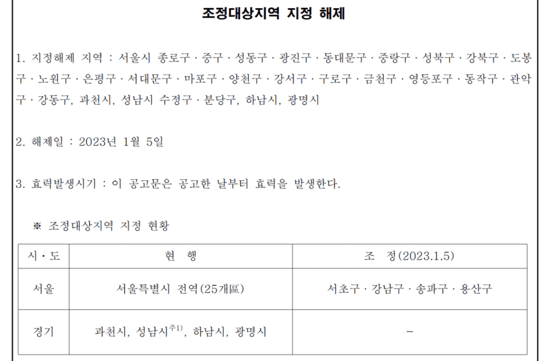 23년 1월, 서울 4개 구를 제외한 남은 서울의 해제 발표 소식을