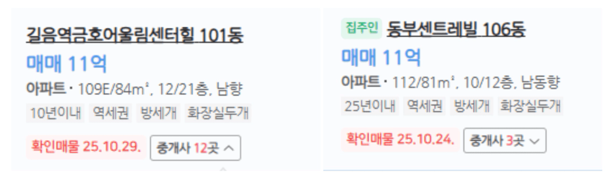 꿈의 숲아이파크가 11.6억, 금호센터필은 11억