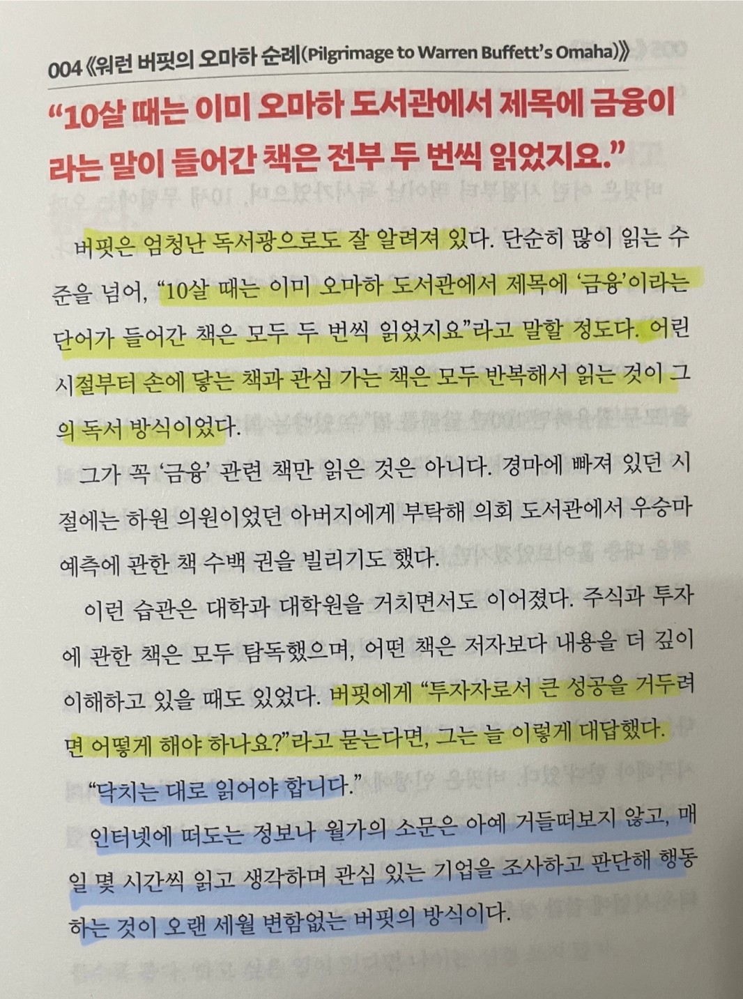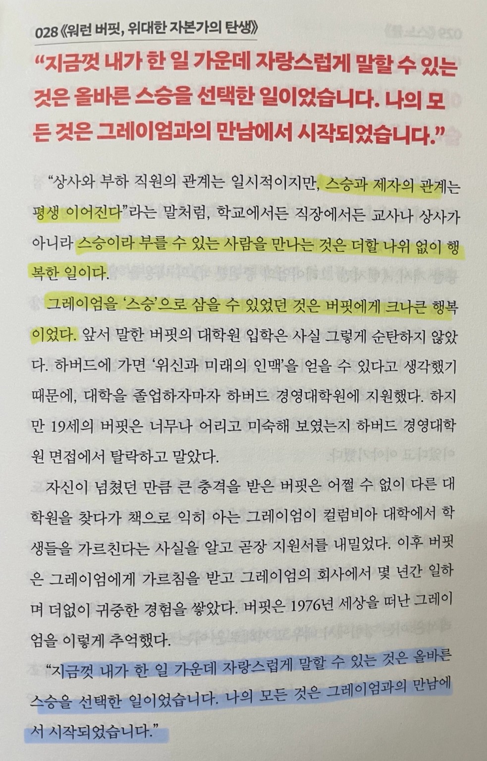 워런 버핏의 20세까지 성장을 관통하는 키워드는 #독서력 #실행력 #좋은스승과의만남 인 것 같습니다. 저 역시도 아이들을 스무살 넘게 키워오면서 돌아보니, 아이 스스의 독서력만큼 부모나 스승, 환경이 주는 영향력도 참 크다는 걸 새삼 더 깨닫습니다. 여러분의 독서력, 실행력, 함께 하는 사람들은 어떤가요? 존경하는 사람들 곁에서 성장할 수 있는 기회 꽉 붙잡고 가는 하루, 오늘도 화이팅입니다💕