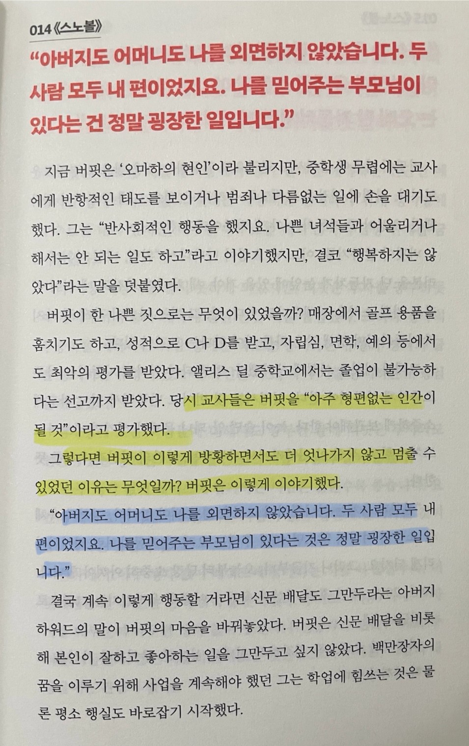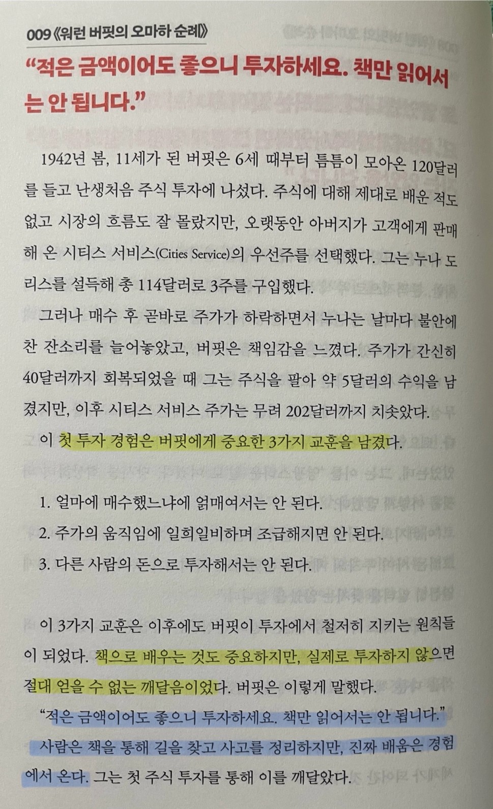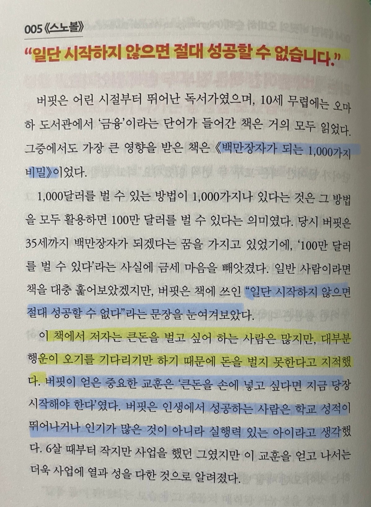 p.20 "일단 시작하지 않으면 절대 성공할 수 없다" .. 버핏이 얻은 중요한 교훈은 '큰돈을 손에 넣고 싶다면 지금 당장 시작해야 한다'였다. 버핏은 인생에서 성공하는 사람은 학교 성적이 뛰어나거나 인기가 많은 것이 아니라 실행력 있는 아이라고 생각했다.