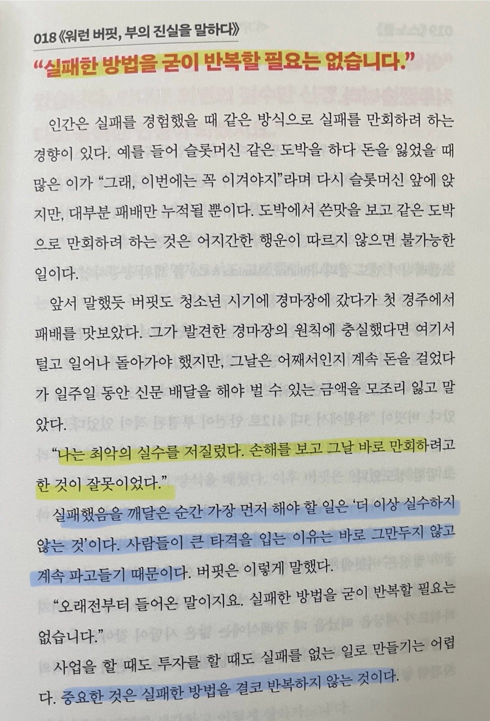 p.33 실패했음을 깨달은 순간 가장 먼저 해야 할 일은 '더 이상 실수하지 않는 것'이다. 사람들이 큰 타격을 입는 이유는 바로 그만두지 않고 계속 파고들기 때문이다. .. 중요한 것은 실패한 방법을 결코 반복하지 않는 것이다.