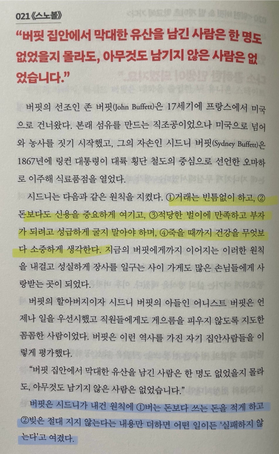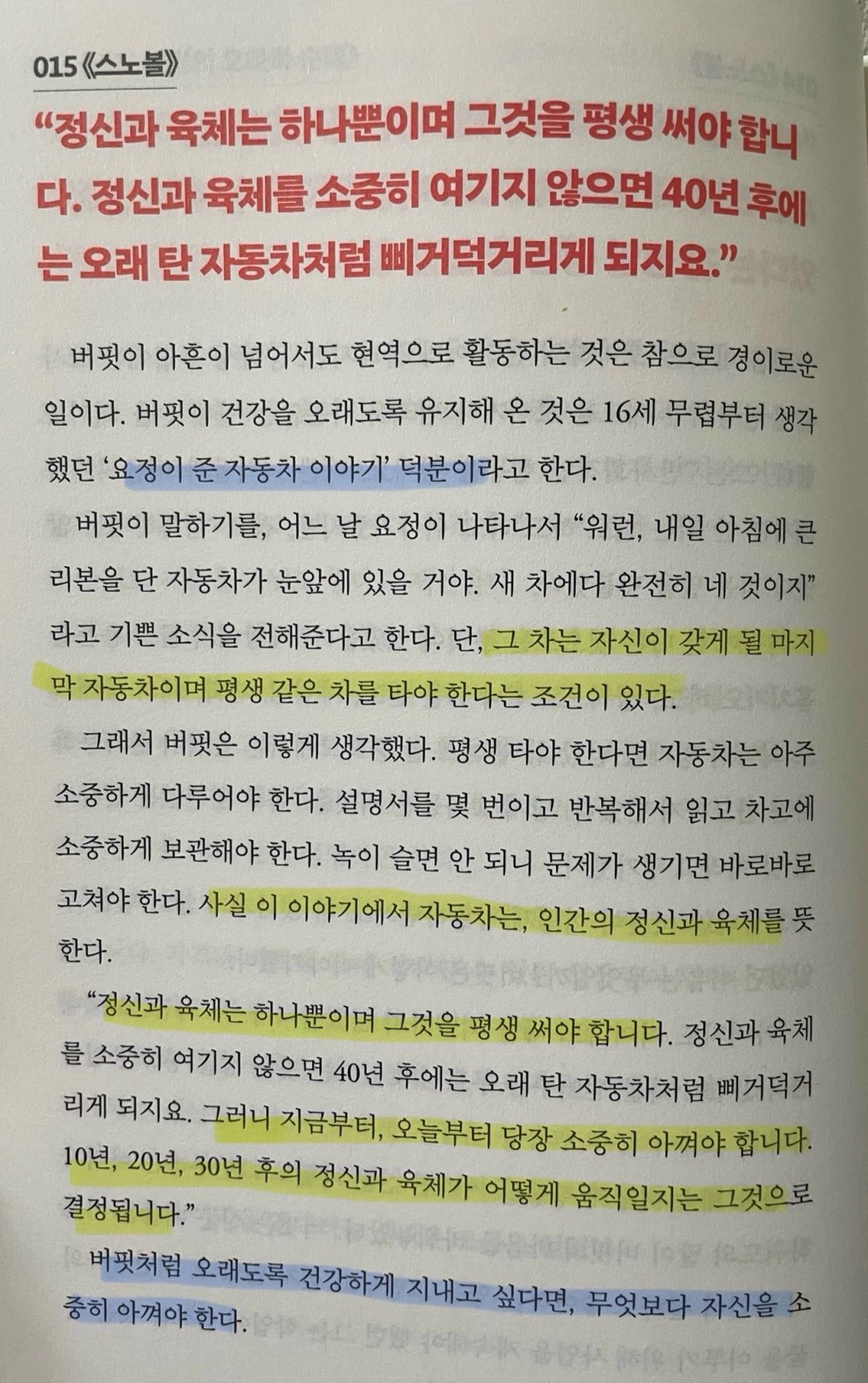 p.30 "정신과 육체는 하나뿐이며 그것을 평생 써야 합니다. .. 그러니 지금부터, 오늘부터 당장 소중히 아껴야 합니다." .. 버핏처럼 오래도록 건강하게 지내고 싶다면, 무엇보다 자신을 소중히 아껴야 한다.