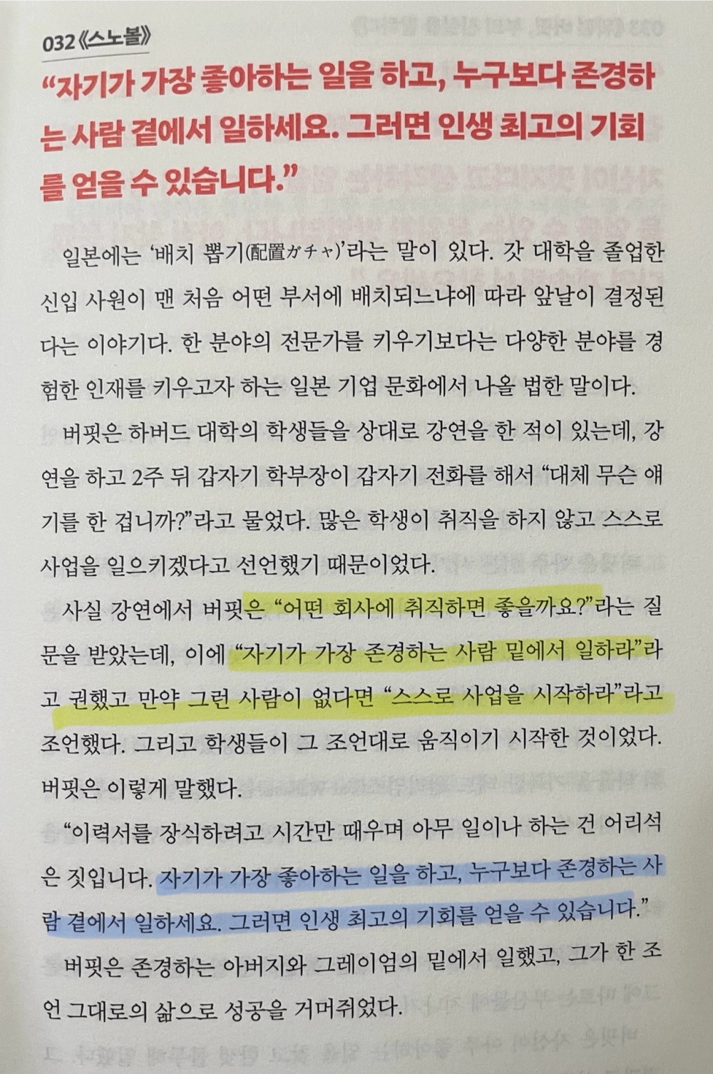 p.47 "자기가 가장 좋아하는 일을 하고, 누구보다 존경하는 사람 곁에서 일하세요. 그러면 인생 최고의 기회를 얻을 수 있습니다."
