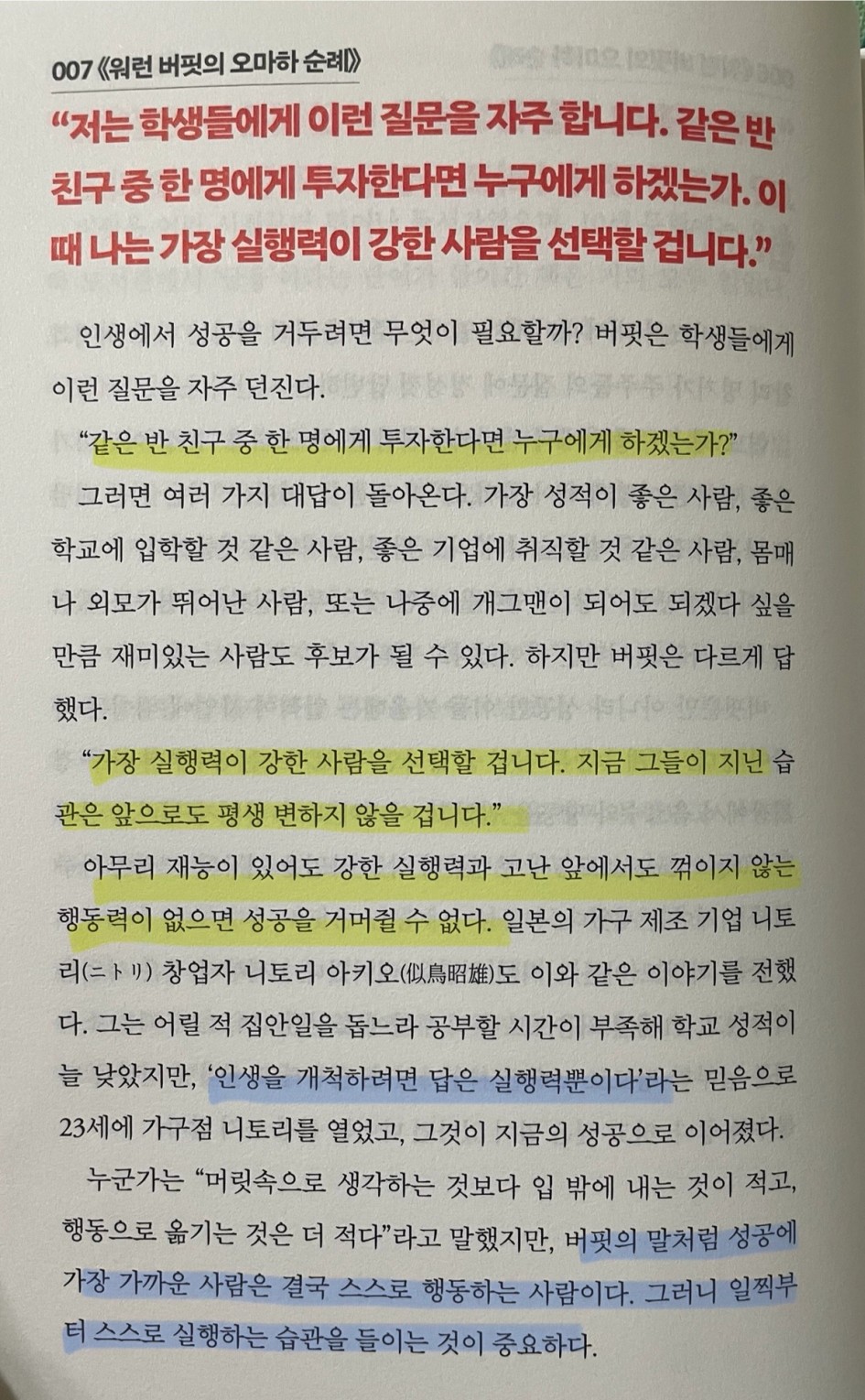 p.22 아무리 재능이 있어도 강한 실행력과 고난 앞에서도 꺾이지 않는 행동력이 없으면 성공을 거머쥘 수 없다. .. 버핏의 말처럼 성공에 가장 가까운 사람은 결국 스스로 행동하는 사람이다.
