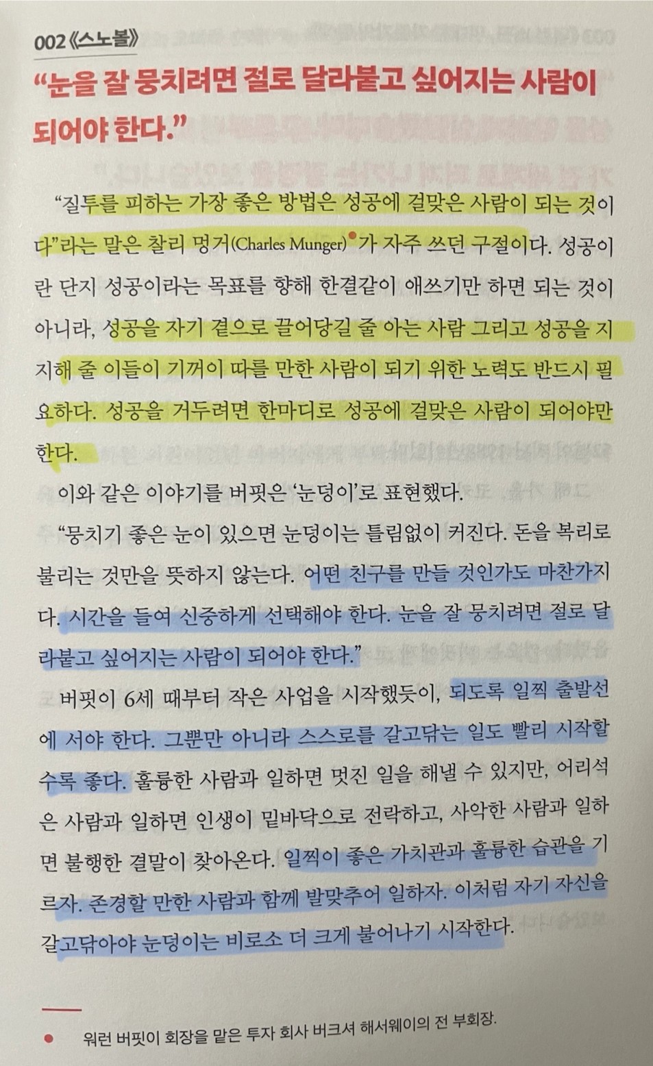 p.17 "어떤 친구를 만들 것인가도 마찬가지다. 시간을 들여 신중하게 선택해야 한다. 눈을 잘 뭉치려면 절로 달라붙고 싶어지는 사람이 되어야 한다." .. 일찍이 좋은 가치관과 훌륭한 습관을 기르자. 존경할 만한 사람과 함께 발맞추어 일하자. 이처럼 자기 자신을 갈고닦아야 눈덩이는 비로소 더 크게 불어나기 시작한다.