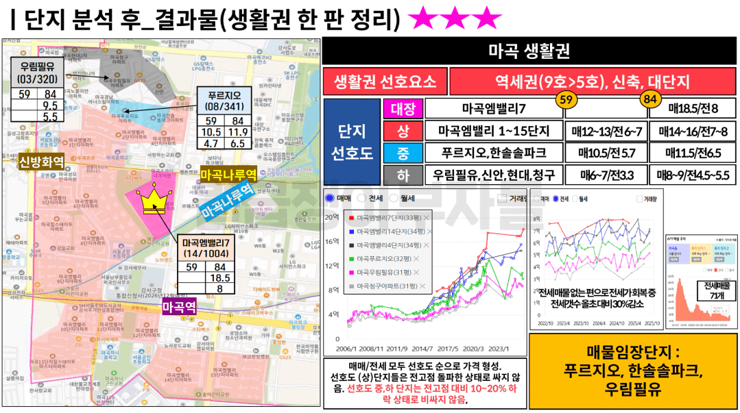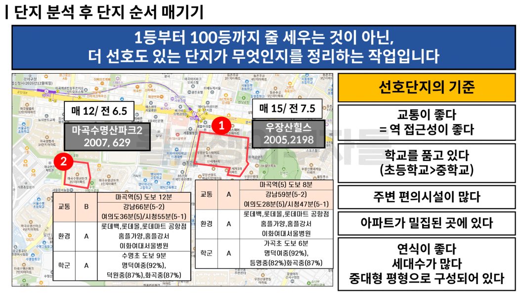 단지 분석 후 → 단지 순서 매기기 (고민 해보고 정 모르겠으면 아실 그래프 붙여보기) → 생활권 한판정리 결론 (생각) → 가격과 가치가 같이 다 들어가 있도록
