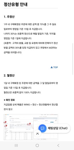 불나무님, 쿠팡은 주정산과 월정산이 있어서 70프로 먼저 들어오고 추후 30프로 지급될겁니다. 사진 참고하세요. 쿠팡 윙 하단 온라인문의에서 정산으로 검색하시면 확인하실 수 있어요