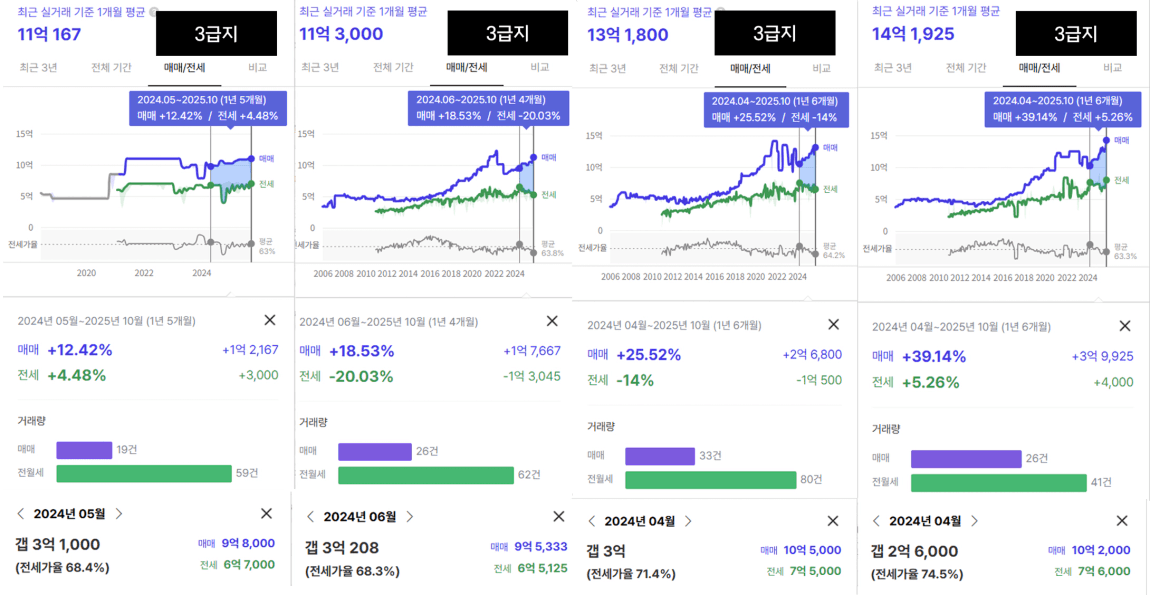 현재 실거래가 기준으로 1.2억 ~ 3.9억까지 수익이 난 단지도 있었습니다.