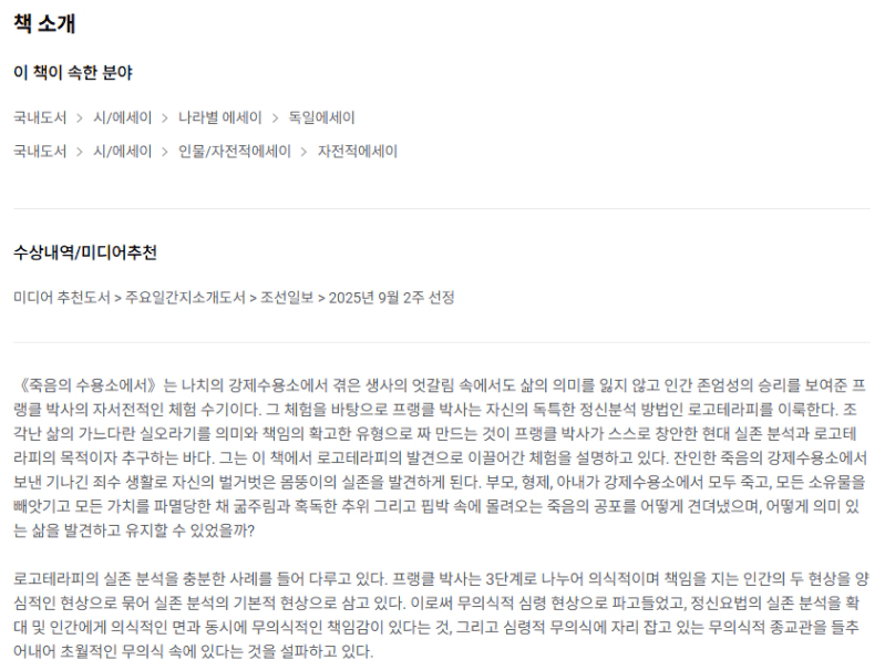 이 책은 저자인 빅터프랭클 (정신과의사)가 나치 강제 수용소에서 경험했던 기록이다