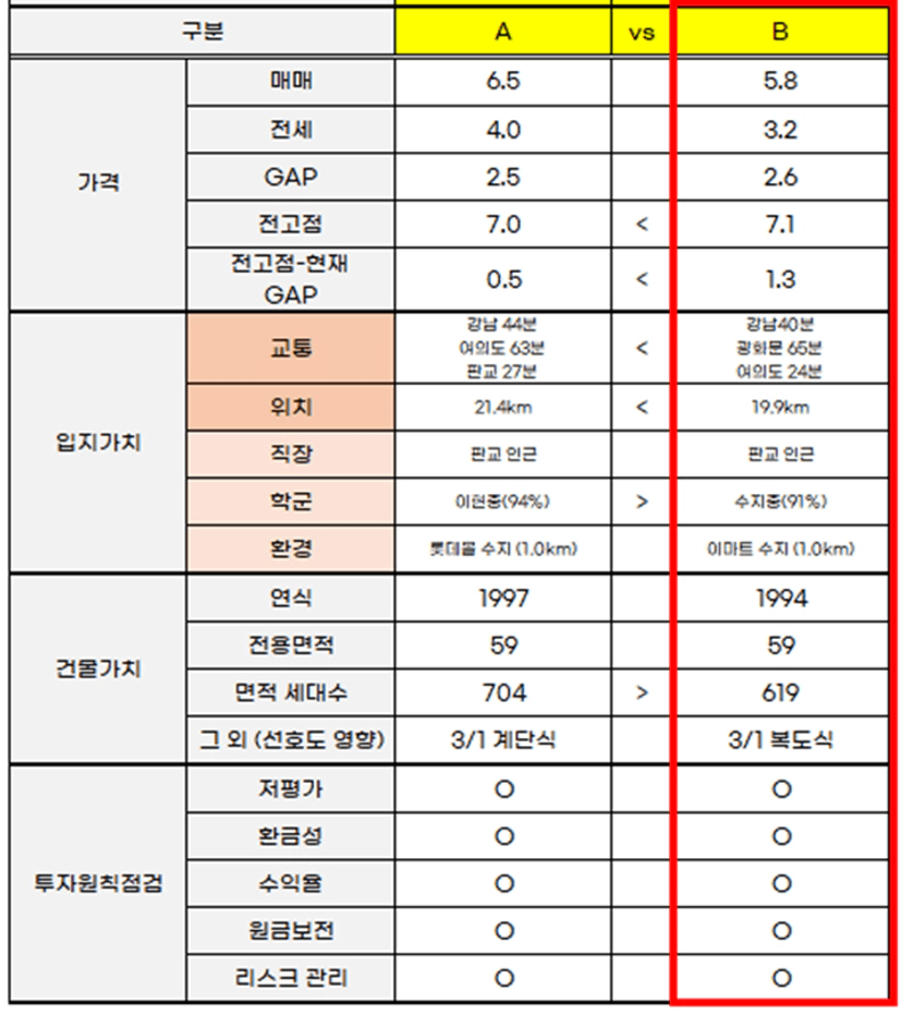 → A단지가 연식도 좋고 세대수도 좀 더 많지만, 실거주를 고려한다면 매가가 더 저렴하고 전고점은 근소하게 높으면서도 예상 투자 수익이 더 놓고, 강남접근성도 조금 더 좋은 B단지를 선택하겠다.