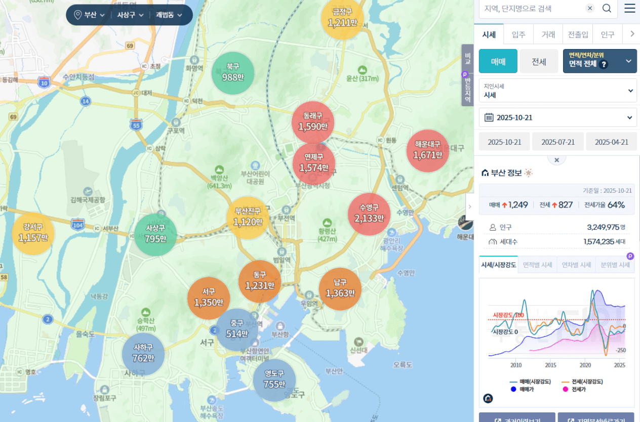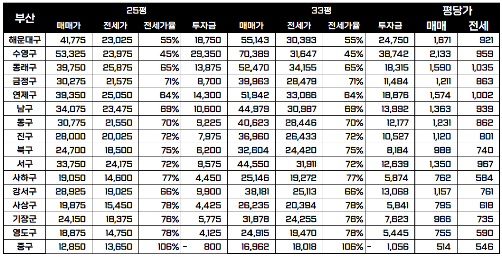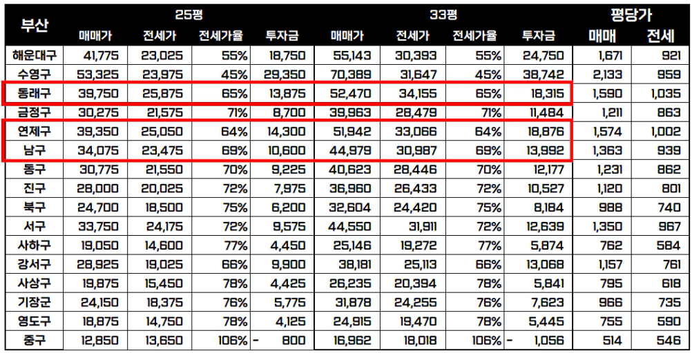 그럼 아래의 후보들 중에서도 평당가가 가장 높은 동래구를