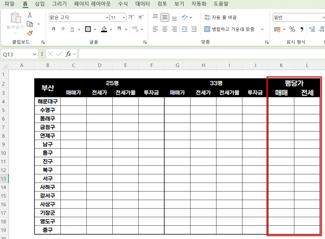 평형별 매매가/전세가/전세가율/투자금 칸을 만들어둡니다.