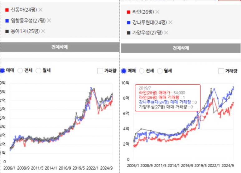 신동아나 동아1차는 주변 단지들하고 비슷한 흐름을 보였는데, 라인의 경우는 같은 가양역 초 역세권 단지들하고 비교했을 때 좀 더 낮은 시세를 보였습니다. 이런 경우는 매임을 통해서 왜 다른 단지들보다 선호도?가 낮은지, 가격형성이 낮은지 알아보아야 할까요??