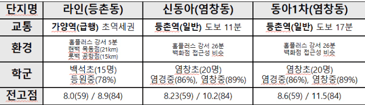 생활권에서는 염창 > 등촌이긴 하지만, 라인 아파트가 가양역(9호선, 급행) 초역세권인 반면에 신동아나 동아1차의 경우 염창동 생활권이지만 염창역(9호선, 급행)이랑 거리도 멀고 등촌역(9호선,일반)하고도 꽤 거리가 멉니다.