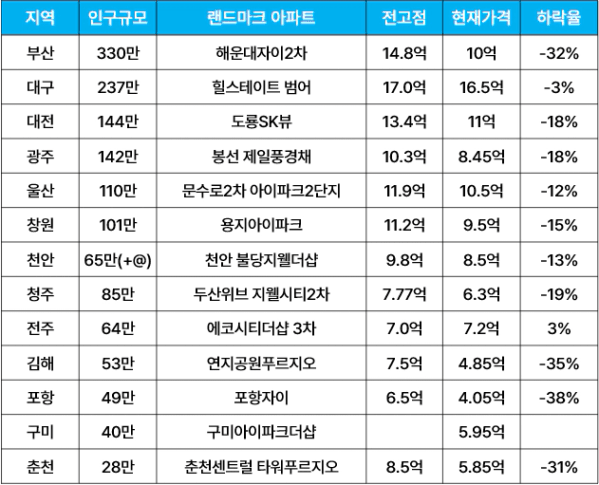 현시점 랜드마크 가격과 전고점대비 하락율입니다. (25. 10. 31기준)