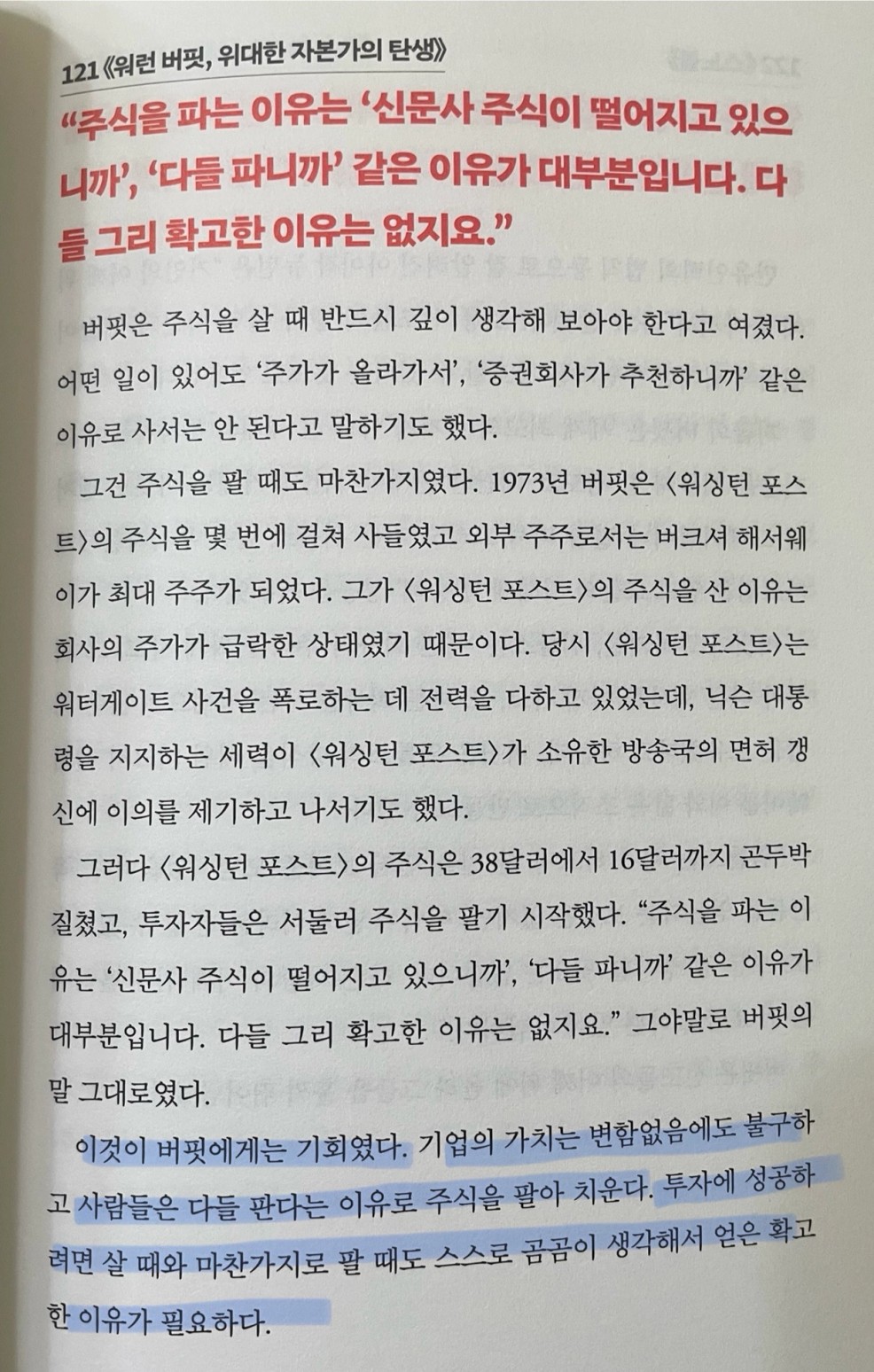 p.141 이것이 버핏에게는 기회였다. 기업의 가치는 변함없음에도 불구하고 사람들은 다들 판다는 이유로 주식을 팔아 치운다. 투자에 성공하려면 살 때와 마찬가지로 팔 때도 스스로 곰곰이 생각해서 얻은 확고한 이유가 필요하다.