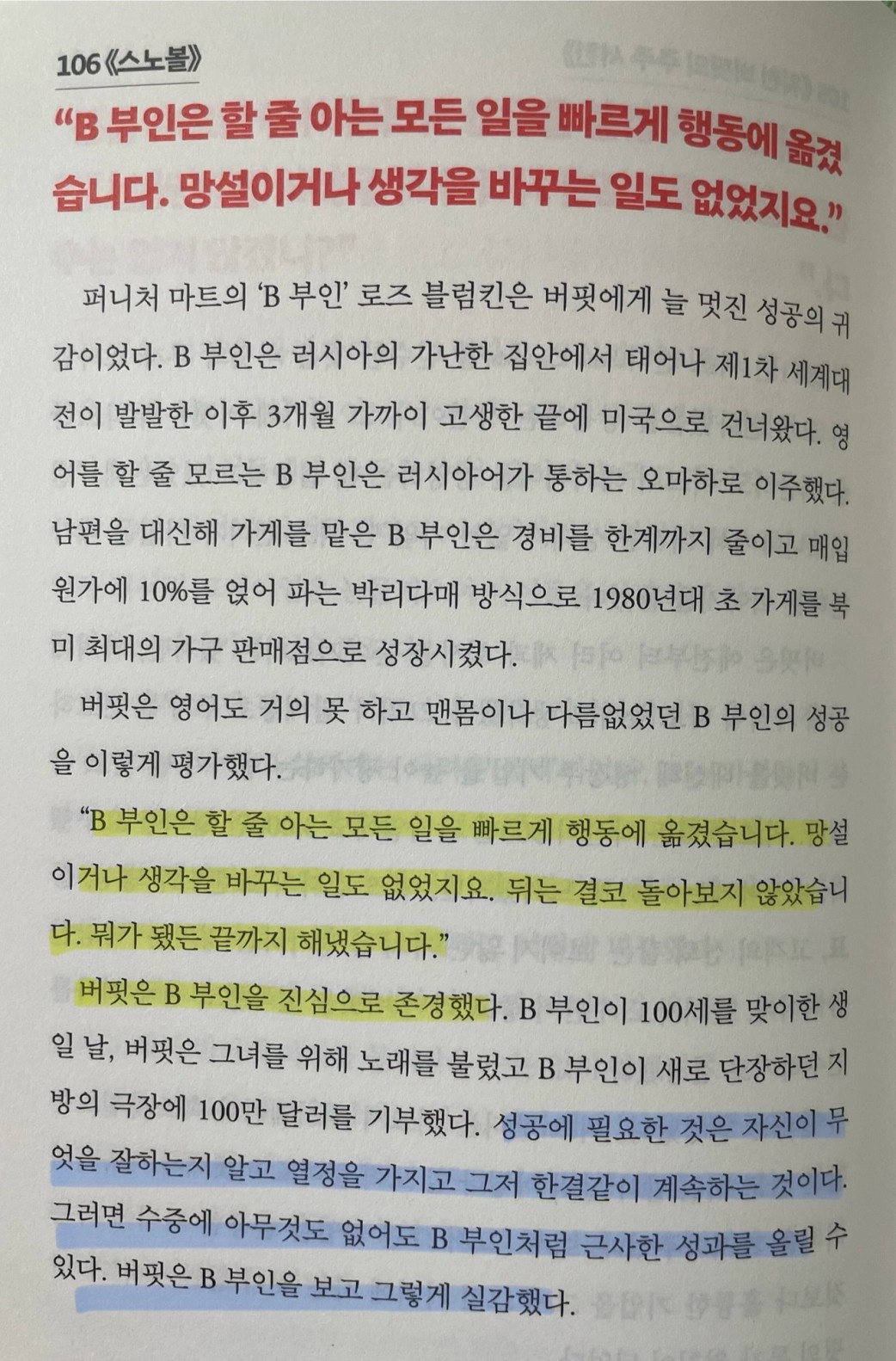 p.126 "B 부인은 할 줄 아는 모든 일을 빠르게 행동에 옮겼습니다. 망설이거나 생각을 바꾸는 일도 없었지요. 뒤는 결코 돌아보지 않았습니다. 뭐가 됐든 끝까지 해냈습니다." .. 성공에 필요한 것은 자신이 무엇을 잘하는지 알고 열정을 가지고 그저 한결같이 계속하는 것이다.