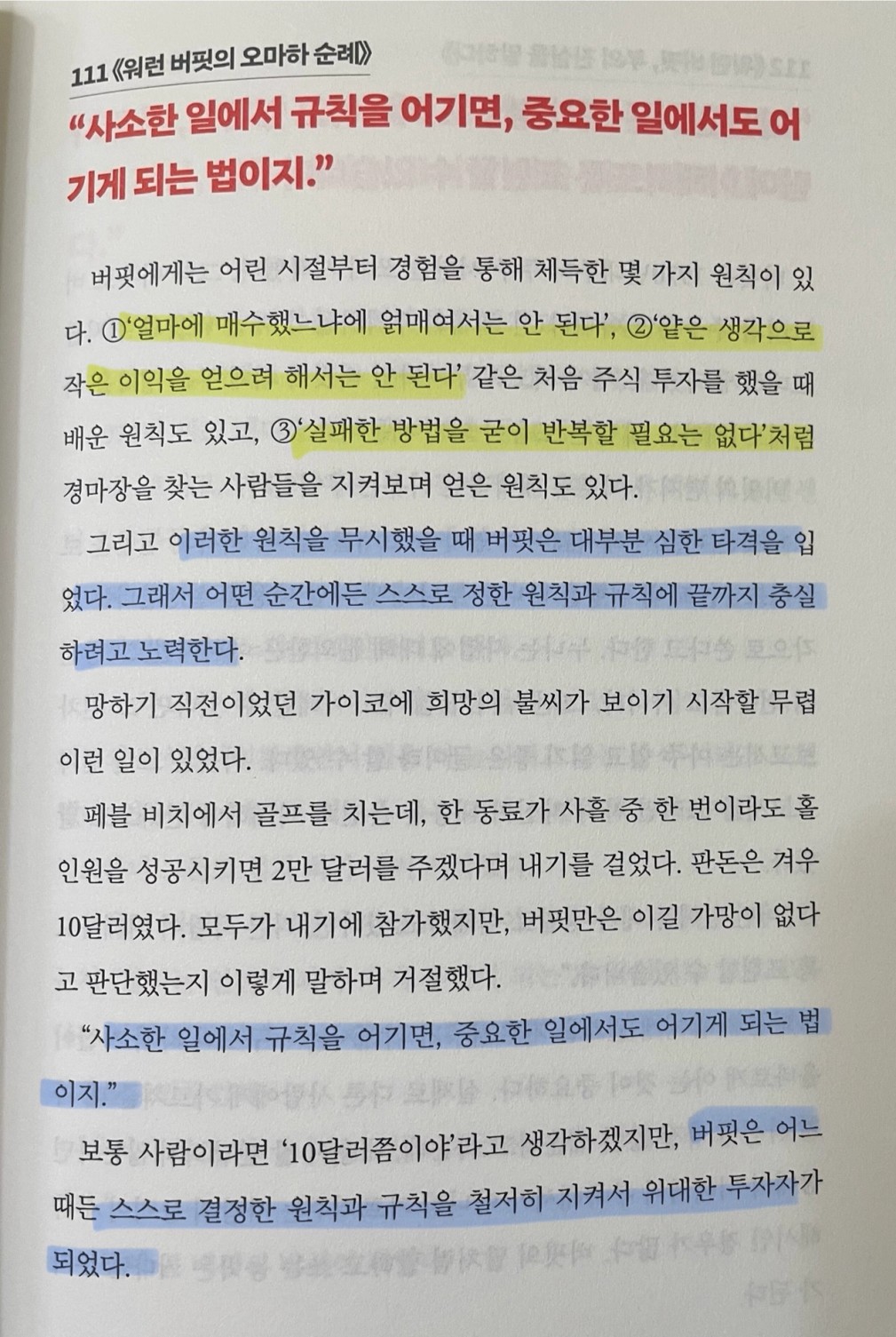 p.131 "사소한 일에서 규칙을 어기면, 중요한 일에서도 어기게 되는 법이지." .. 버핏은 어느 때든 스스로 결정한 원칙과 규칙을 철저히 지켜서 위대한 투자자가 되었다.
