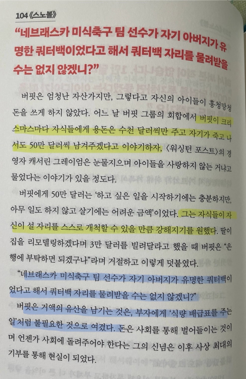 p.124 "네브래스카 미식축구 팀 선수가 자기 아버지가 유명한 쿼터백이었다고 해서 쿼터백 자리를 물려받을 수는 없지 않겠니?" 버핏은 거액의 유산을 남기는 것은, 부자에게 '식량 배급표를 주는 일'처럼 불필요한 것으로 여겼다. 돈은 사회를 통해 벌어들이는 것이며 언젠가 사회에 돌려주어야 한다는 그의 신념은 이후 사상 최대의 기부를 통해 현실이 되었다.