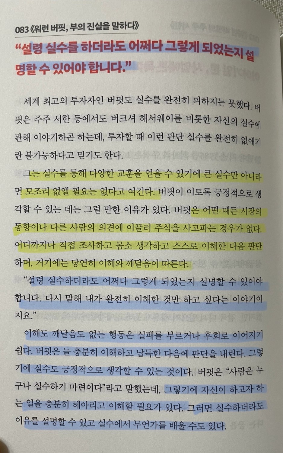 p.100 이해도 깨달음도 없는 행동은 실패를 부르거나 후회로 이어지기 쉽다. 버핏은 늘 충분히 이해하고 납득한 다음에 판단을 내린다. 그렇기에 실수도 긍정적으로 생각할 수 있는 것이다. .. 그러면 실수하더라도 이유를 설명할 수 있고 실수에서 무언가를 배울 수도 있다.