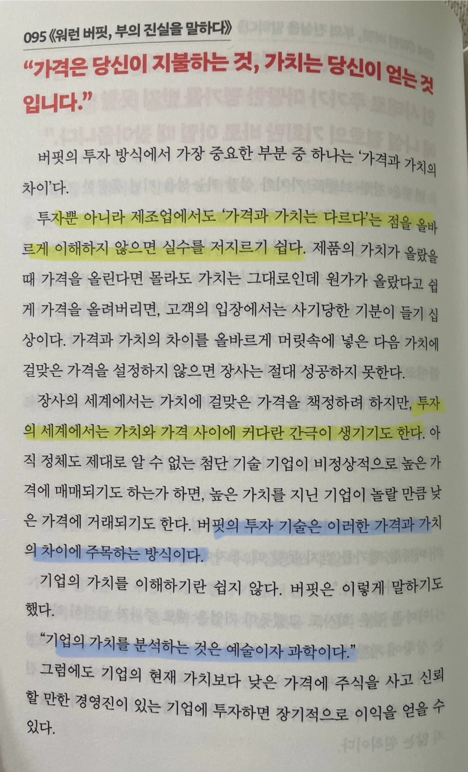 p.112 투자의 세계에서는 가치와 가격 사이에 커다란 간극이 생기기도 한다. .. 버핏의 투자 기술은 이러한 가격과 가치의 차이에 주목하는 방식이다. .. "기업의 가치를 분석하는 것은 예술이자 과학이다."