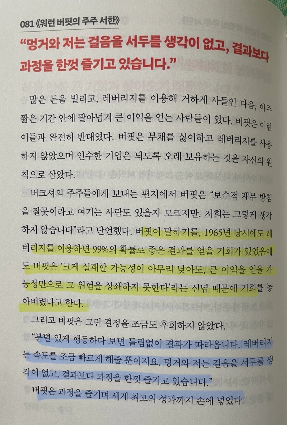 -버핏은 늘 충분히 이해하고 납득한 다음에 판단을 내린다. 그렇기에 실수도 긍정적으로 생각할 수 있는 것이다.