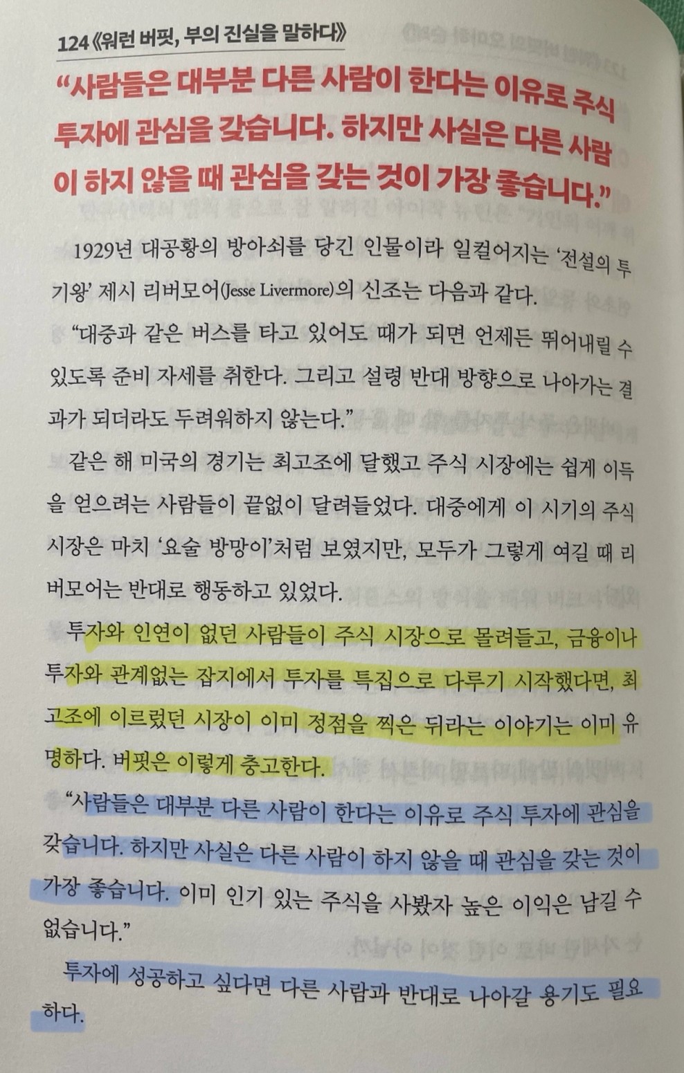 p.144 "사람들은 대부분 다른 사람이 한다는 이유로 주식 투자에 관심을 갖습니다. 하지만 사실은 다른 사람이 하지 않을 때 관심을 갖는 것이 가장 좋습니다." .. 투자에 성공하고 싶다면 다른 사람과 반대로 나아갈 용기도 필요하다.