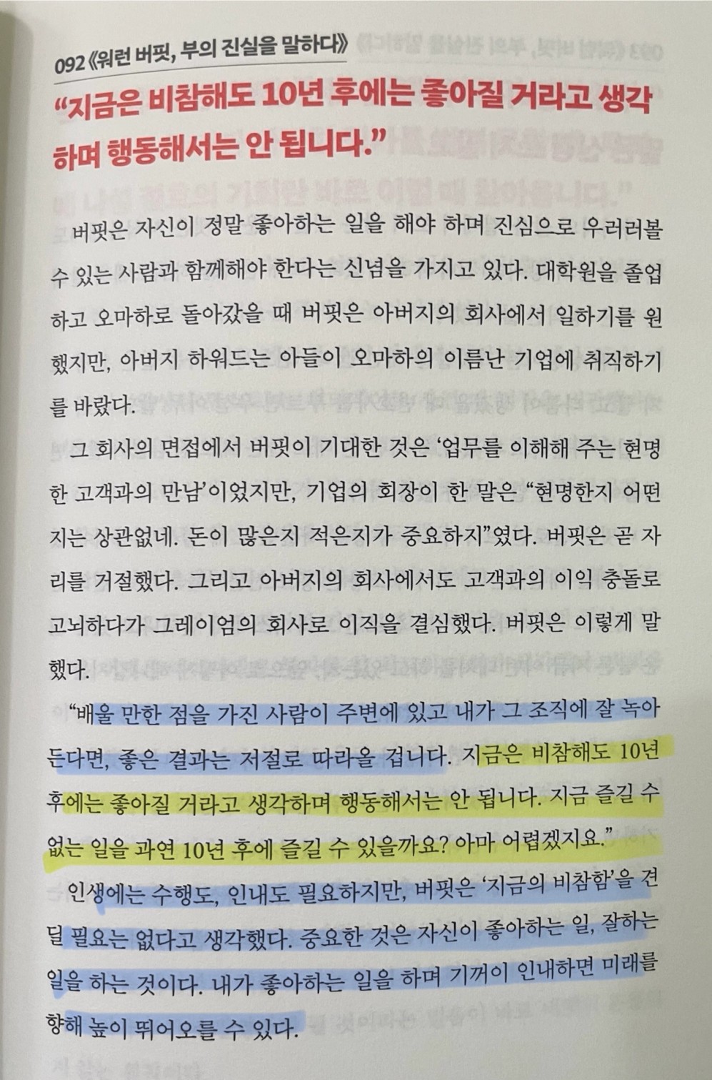 p.109 "배울 만한 점을 가진 사람이 주변에 있고 내가 그 조직에 잘 녹아 든다면, 좋은 결과는 저절로 따라올 겁니다. 지금은 비참해도 10년 후에는 좋아질 거라고 생각하며 행동해서는 안 됩니다. 지금 즐길 수 없는 일을 과연 10년 후에 즐길 수 있을까요? " .. 중요한 것은 자신이 좋아하는 일, 잘하는 일을 하는 것이다. 내가 좋아하는 일을 하며 기꺼이 인내하면 미래를 향해 높이 뛰어오를 수 있다.