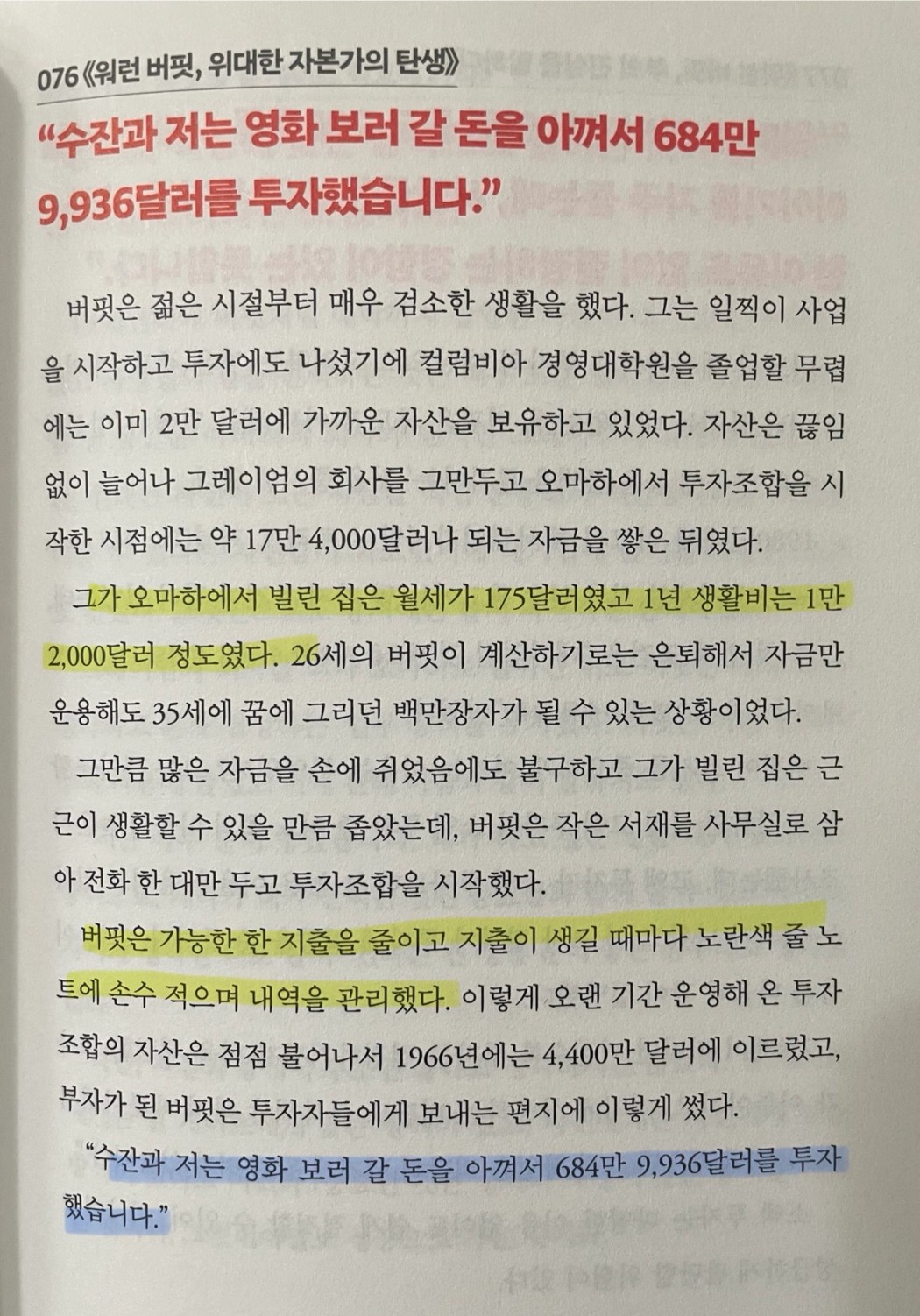 오늘 읽은 내용에 26세의 버핏이 오마하에서 빌린 집은 월세가 175달러였고, 1년 생활비는 1만 2,000달러 정도였다고 합니다. "수잔과 저는 영화 보러 갈 돈을 아껴서 684만 9,936달러를 투자했습니다." 라고 한 버핏의 말에서 685만 달러가 얼마인지 계산해보니 지금 가치로 90억원이 넘더라구요.😳