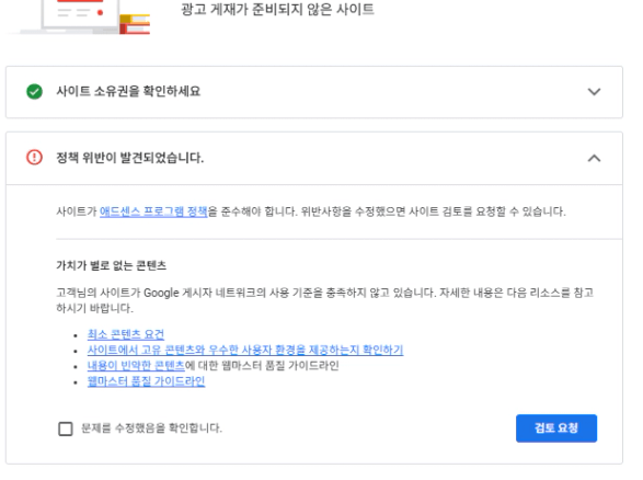• 질문 내용: 애드센스 사이트에 아래와 같은 이유로 거부되었습니다.