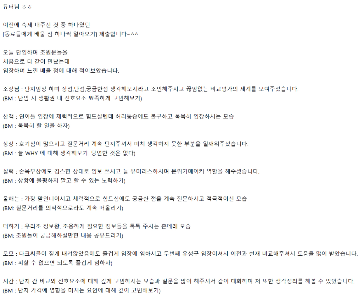 튜터링데이 때 일대일로 나눴던 대화들과 따뜻한 시선으로 바라봐주시던 모습은 오래오래 간직할 것 같습니다.