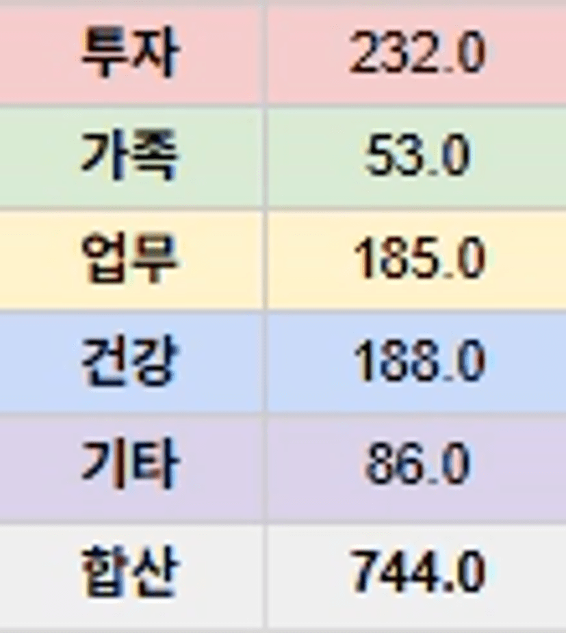 • 수면 / 202시간 (일 6.7시간) → 188시간 (일 6.06시간)