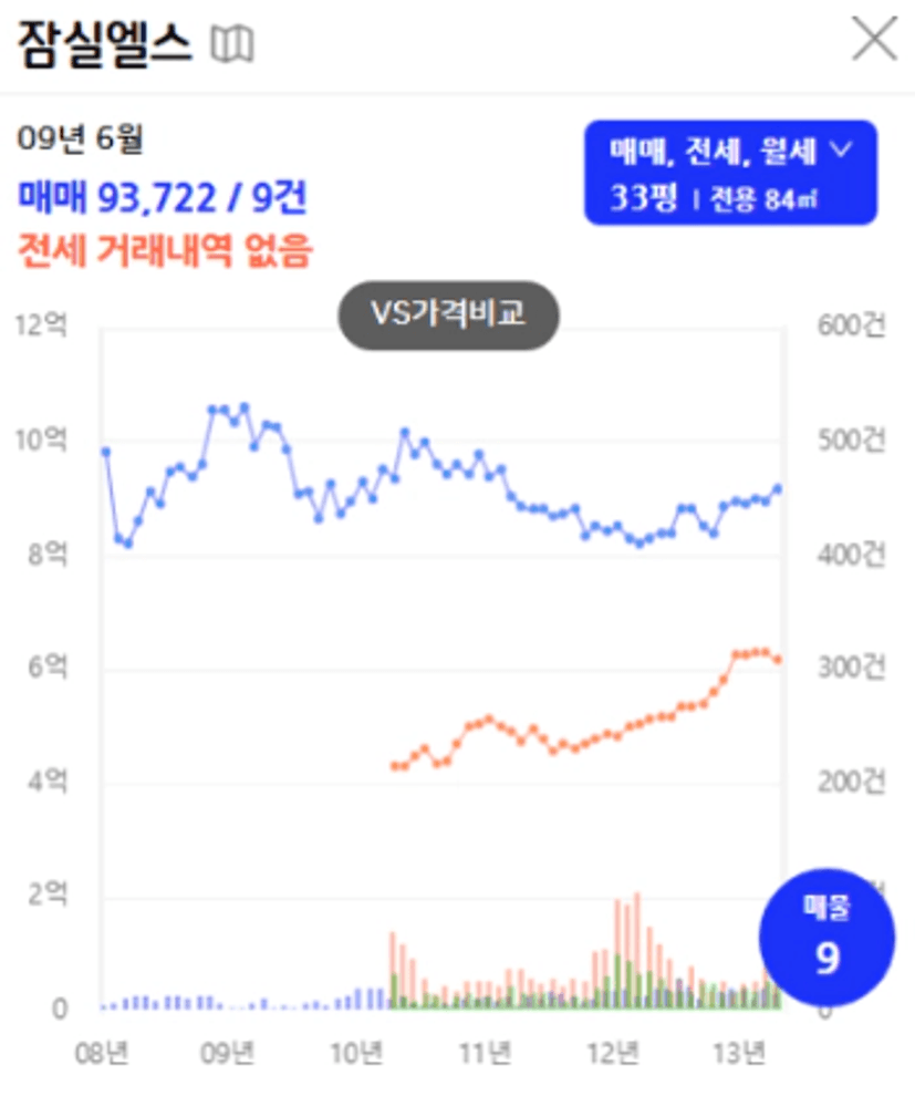 사람들이 너무나 좋아하는 송파구 잠실동의 아파트 가격 흐름입니다. 09년 6월 9.3억에서 10월 초 1억이 뜁니다.