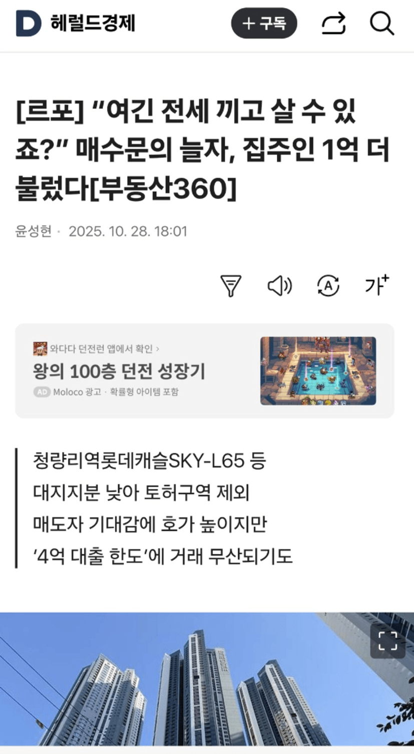 이럴 때 우선 투자금을 생각해봅니다. 제가 18억이라 말씀드린 청량리 주상복합 30평대 단지는, 전세가가 약 8억입니다. 즉 매전차로만 봐도 현금이 10억 필요합니다.
