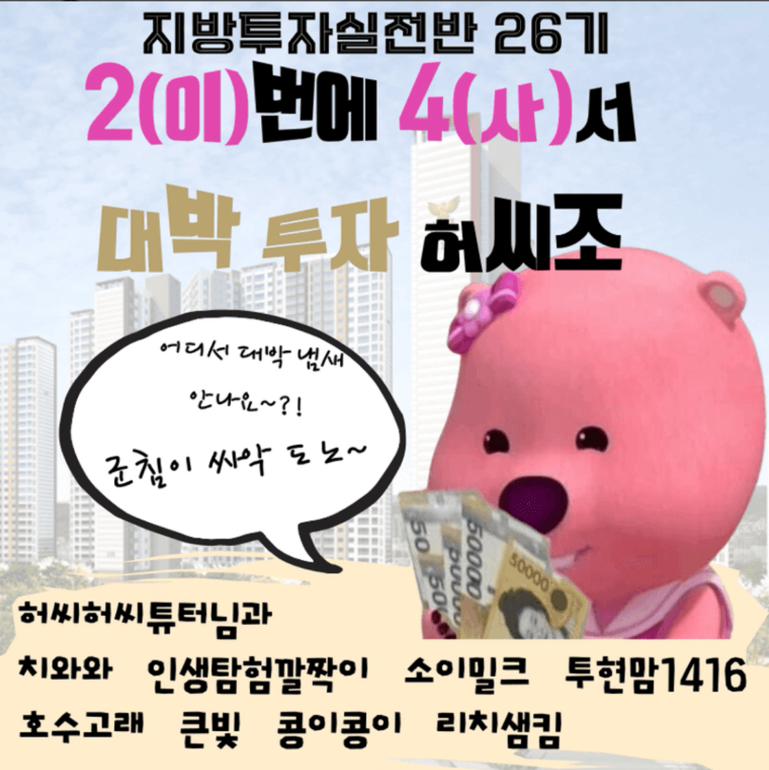 10월 지방투자실전반 대박이들과 허씨튜터님을 통해 너무나 많은 성장을 이뤄낼 수 있었던 것 같아 감사드립니다.