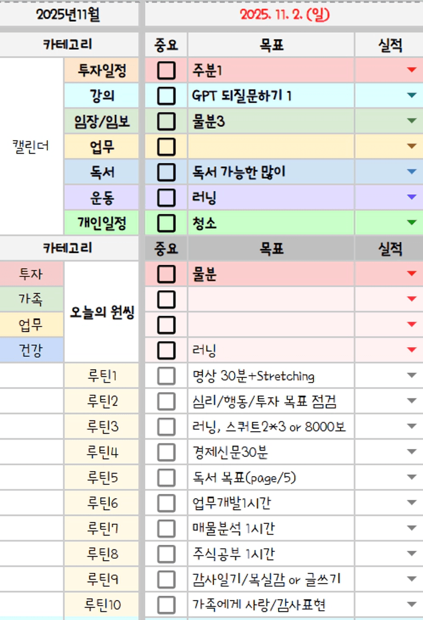 아침에 계획을 세우고 저녁에 복기를 합니다.