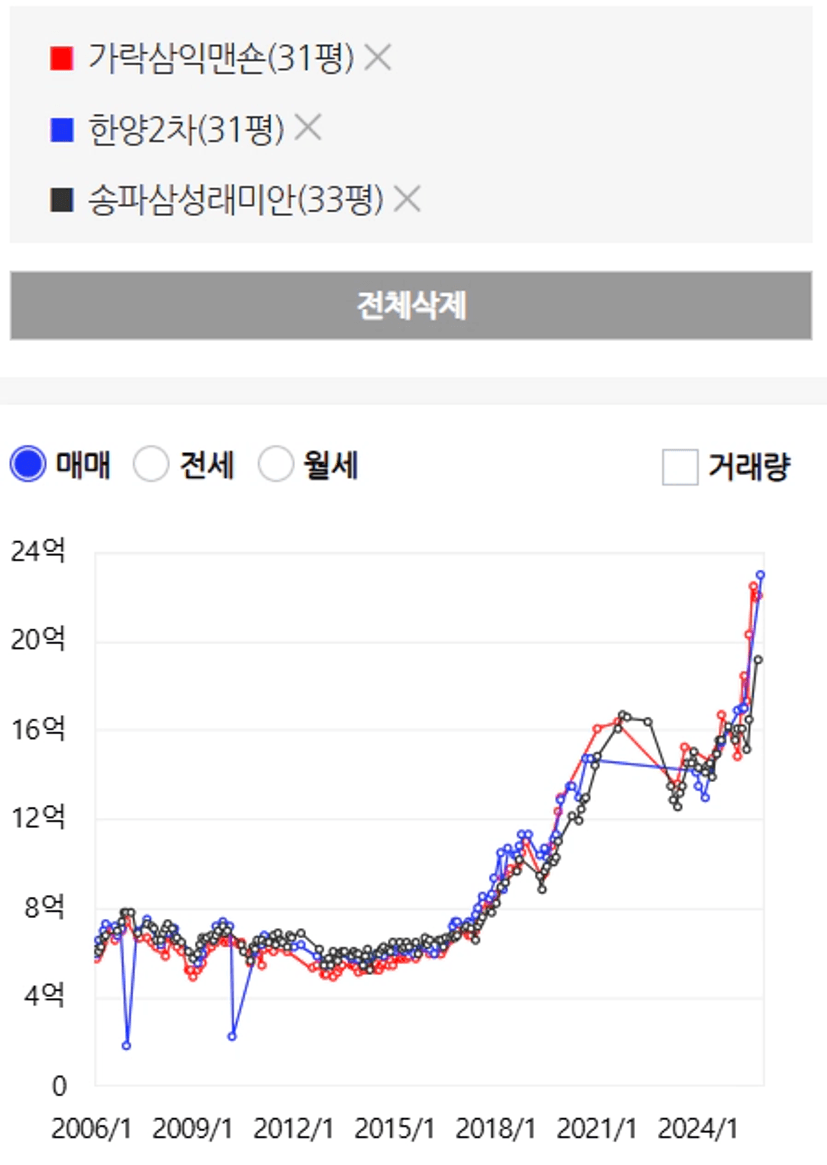 최근에 보면 한양2차 및 가락삼익맨숀 둘 다 송파삼성래미안을 보다 압도하는 실거래 기록을 세웠습니다.