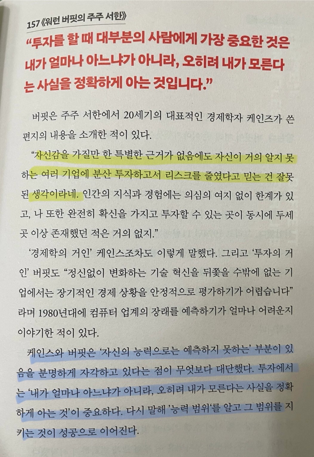 -투자에서는 '내가 얼마나 아느냐가 아니라, 오히려 내가 모른다는 사실을 정확하게 아는 것'이 중요하다. 다시 말해 '능력 범위'를 알고 그 범위를 지키는 것이 성공으로 이어진다.