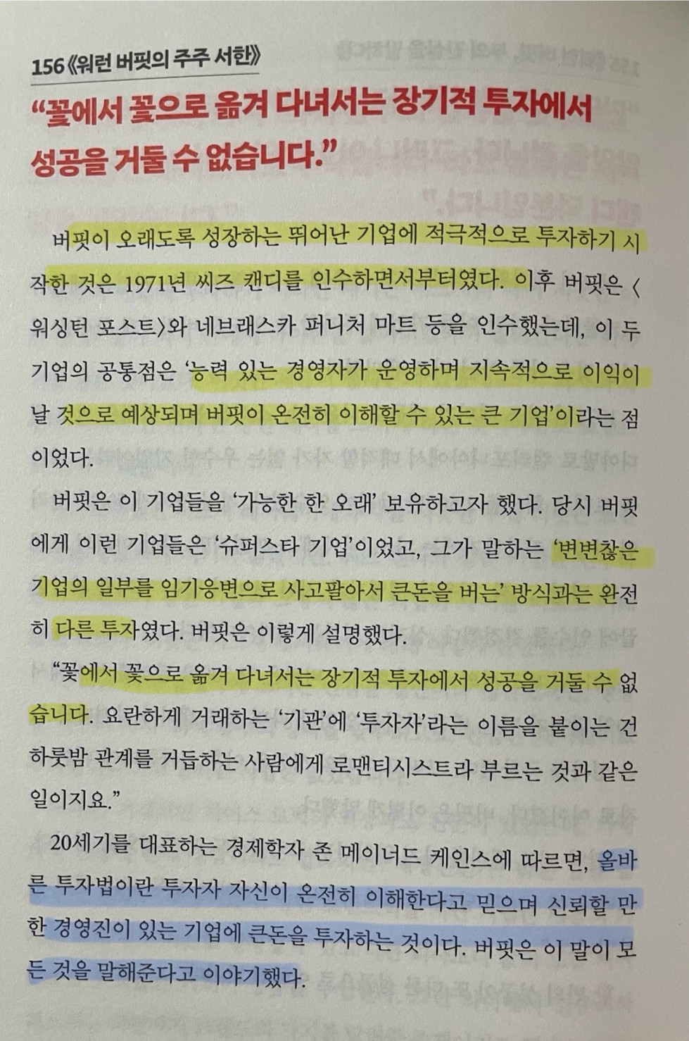 p.176 "꽃에서 꽃으로 옮겨 다녀서는 장기적 투자에서 성공을 거둘 수 없습니다." .. 올바른 투자법이란 투자자 자신이 온전히 이해한다고 믿으며 신뢰할 만한 경영진이 있는 기업에 큰돈을 투자하는 것이다. 버핏은 이 말이 모든 것을 말해준다고 이야기했다.